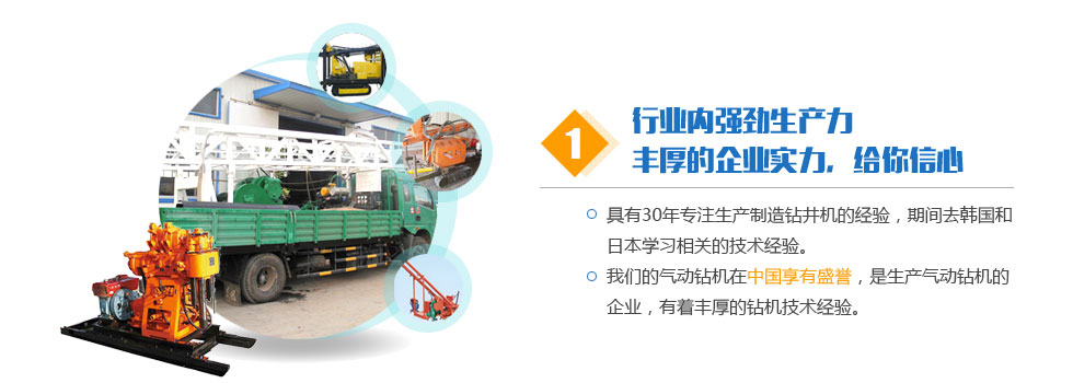 客戶共創(chuàng)雙贏。堅(jiān)持科技先導(dǎo)、質(zhì)量第一、信譽(yù)第一。讓我們用真誠(chéng)的智慧共同締造事業(yè)的成功。讓我們用真誠(chéng)的智慧共同締造事業(yè)的成功。希望與您的合作,能為我們的雙方共添輝煌。經(jīng)營(yíng)宗旨:質(zhì)量求生存,信譽(yù)樹品牌,價(jià)格贏打井設(shè)備市場(chǎng),創(chuàng)新圖發(fā)展。我們將以一流的技術(shù)換取您的信賴和欣慰。公司以人為本,廣納天下人才,技術(shù)力量雄厚。公司堅(jiān)持以人為本,以優(yōu)取勝,精誠(chéng)服務(wù),持續(xù)改進(jìn)的質(zhì)量方針和氣動(dòng)鉆機(jī)服務(wù)宗旨。真誠(chéng)地與